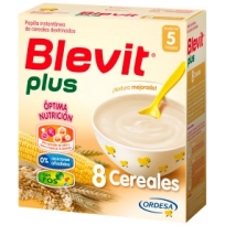 Blevit plus 8 Cereales es una papilla muy completa elaborada a partir de una mezcla equilibrada de trigo, arroz, avena, cebada, centeno, maíz, mijo y sorgo. La mezcla de sus cereales en las proporciones adecuadas ayuda a cubrir las necesidades nutricionales del bebé y contribuye a su crecimiento y desarrollo.