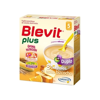 Además, la textura de Blevit® 8 cereales al estilo bizcocho son ricos en fructooligosacáridos (FOS), que favorece el crecimiento de una flora intestinal rica en bífidobacterias y lactobacilos, relacionados con el correcto desarrollo del tracto digestivo del bebé.