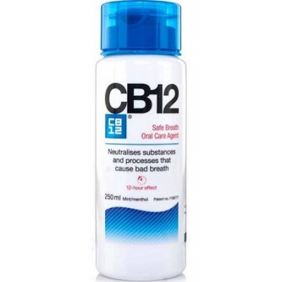 CB12 neutraliza las sustancias y procesos que provocan el mal aliento. Su fórmula patentada posee una composición única que neutraliza y previene la aparición de las sustancias que provocan el mal aliento. Esta composición, cuya investigación se ha realizado en la Universidad de Oslo, es exclusiva de los productos CB12. La eficacia de CB12 se mantiene durante 12 horas, gracias a su fijación química al tejido de la cavidad bucal. Este agente para el cuidado bucal ha sido desarrollado mediante un cromatógrafo de gases especialmente diseñado para ello, que también se ha usado para evaluar y documentar sus resultados. Se trata de un instrumento desarrollado específicamente para detectar gases sulfurosos, del que solo existen unas cuantas unidades en el mundo. CB12 contiene fluoruro. A muchas personas les gusta enjuagarse con CB12 justo después de haberse cepillado los dientes. Por ello se le ha incorporado un 0,05 % de fluoruro de sodio como medida preventiva añadida. El enjuague diario con fluoruro posee un efecto documentado contra la caries y es un excelente complemento a la pasta de dientes fluorizada. INDICACIONES CB12 previene y trata el mal aliento, neutralizando los gases sulfúricos malolientes de la boca. Su efecto es inmediato y logra un aliento sin olor durante 12 horas.
