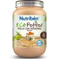 El Eco Potito Nutribén está elaborado sin ingredientes alergénicos, sin gluten, sin huevo, sin leche, sin sales añadidas y sin colorantes ni conservantes. El Eco Potito Nutribén Pollo con Verduras Selectas de 250 gramos es un alimento ideal para los niños a partir de los 6 meses dado que proporciona una alimentación equilibrada a los más pequeños