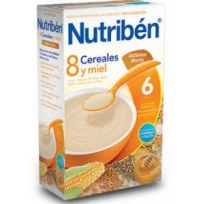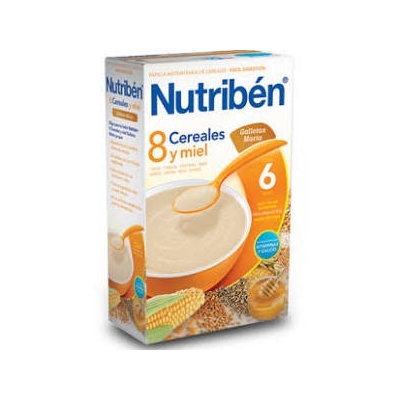 Papilla de 8 cereales (trigo, cebada, centeno, maíz, arroz, avena, mijo y sorgo) con miel y galletas preparada con Nutribén que le aporta su suave sabor y alto valor nutricional.