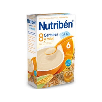 Papilla de 8 cereales (trigo, cebada, centeno, maíz, arroz, avena, mijo y sorgo) con miel y calcio preparada con Nutribén que le aporta, además de su suave sabor, todas las propiedades de la miel.