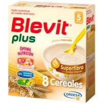 Blevit plus Superfibra 8 Cereales es una papilla elaborada a partir de una equilibrada mezcla de 8 cereales (trigo integral, arroz integral, cebada, centeno, maíz, mijo, sorgo y avena), y fructooligosacáridos e inulina, que ayudan a normalizar el tránsito intestinal de una forma natural. La mezcla de sus cereales en las proporciones adecuadas ayuda a cubrir las necesidades nutricionales del bebé y contribuye a su crecimiento y desarrollo.