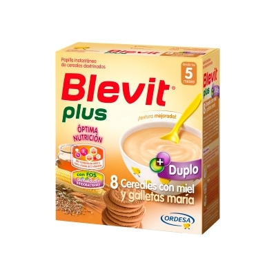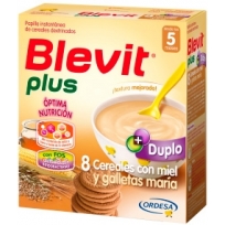 Blevit plus Duplo 8 Cereales con miel y galletas maría es una papilla elaborada a partir de una equilibrada mezcla de 8 cereales (trigo, arroz, avena, cebada, centeno, maíz, mijo y sorgo), miel y galletas maría. Las galletas maría y la miel proporcionan a la papilla un elevado valor nutricional y la convierten en una excelente fuente de energía con un delicioso sabor y textura.