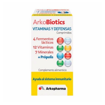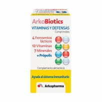 Arkobiotics Vitaminas y Defensas adultos comprimidos es un complemento alimenticio que contiene fermentos lácticos, 12 vitaminas, 7 minerales y extracto de Própolis. Las Vitaminas A, B6, B12, C, el Cobre, el Hierro, el Selenio y el Zinc ayudan al normal funcionamiento del sistema inmunitario. La Vitaminas B5, B12, C, el Cobre, el Hierro y el Manganeso contribuyen al mantenimiento de un metabolismo energético normal. Además, las Vitaminas B2, B5, B12 y C ayudan a disminuir el cansancio y la fatiga.