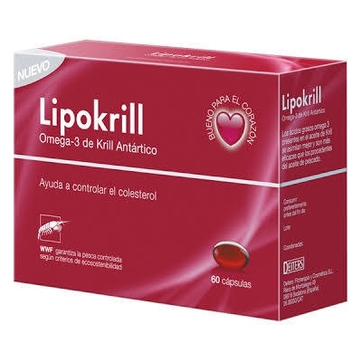 Lipokrill es un preparado alimenticio que ayuda a controlar los niveles de colesterol.Son cápsulas de gelatina blanda con un alto contenido en fosfolípidos de omega -3 procedentes del aceite de Krill, dispersables en agua, de rápida absorción.