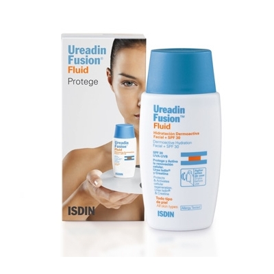 Hidratación Dermoactiva Facial + SPF 30. Todo tipo de pieles. Con Urea Isdin y Creatina. Hidrata intensamente 24 horas: la asociación de Urea Isdin y de Creatina retiene el agua y restablece los niveles óptimos de hidratación. Protege frente a los efectos de la radiación solar gracias a la combinación de antioxidantes y una elevada protección solar SPF30. Activa la renovación celular desde el interior y previene los signos del envejecimiento celular: - Aumenta la capacidad protectora y reparadora de las células, recuperando su energía y vigor. - Estimula la síntesis de colágeno y elastina, aumentando la firmeza y elasticidad de la piel. - Ayuda a reducir las finas líneas de expresión. Tecnología Fusion que se funde con la piel. Textura fluida y ligera de fácil extensibilidad y rápida absorción: tacto sedoso.